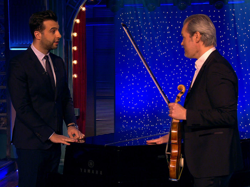 Ведущий и гость поговорили об уникальной скрипке Страдивари, на которой играет Вадим Репин, а затем в их исполнении прозвучала виртуозная пьеса Паганини «Венецианский карнавал». Иван Ургант исполнил партию фортепиано.