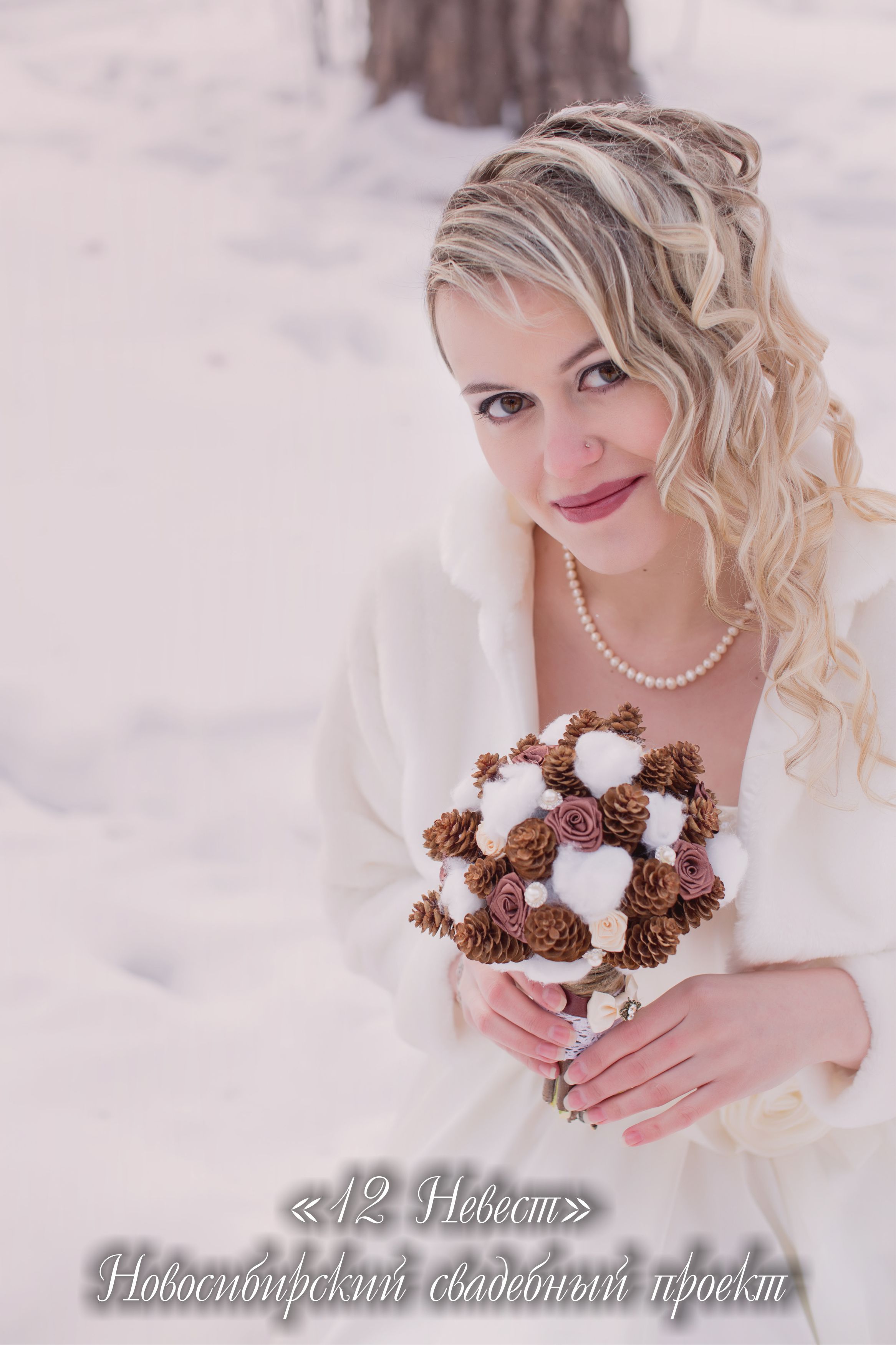 Кристина Дерина, декоратор и эко-флорист: "Меня привлекла эта съемка необычными условиями. На улице ледяной ветер, сугробы снега вокруг, и все это меркнет рядом с горячими чувствами нашей прекрасной пары. Оформление было в шоколадно-кремовых оттенках с добавлением белого цвета, что бы поддержать основную заснеженную атмосферу. Букет изготовлен из шишек и хлопка. Шишки (еловые, сосновые, пихтовые, кедровые) – один из символов зимы, а поэтому прекрасно подойдут для оформления зимней свадьбы и, прежде всего, букета невесты".
