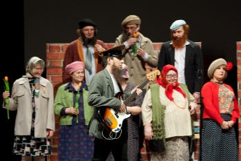 Пока длится многолетнее ожидание, перерастающее в смирение, ветераны НГДТ утрируют свой возраст, нацепив стариковские одежды и распевая хором: "Кому сказать спасибо, что живой?" А молодежь утрирует театральный зажим и сценический невроз, обостряющийся в момент поздравления учителей с юбилеем. Зал падает под кресла, и всем кажется, что жизнь налаживается.