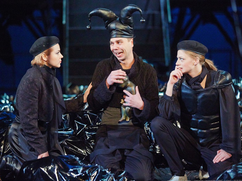 Зачем нам преданья старины глубокой? Изменились время, люди, язык и сама любовь. Изменился воздух, которым наполнено сценическое пространство, напоминающее "Право на остров" Уэльбека с его обезличенными людьми будущего, лишенными даже имен. Апокалипсис с его упорядоченной структурой. Сады Гермократа без единого цветка. Повсюду черные полиэтиленовые мешки, весьма модный нынче сценический атрибут. В краснофакельском "Укрощении строптивой", например, из них мастерят платья, а в глобусовском "Торжестве любви" они становятся универсальными многофункциональными предметами, скрывающими то ли отходы прошлого в виде отживших чувств, то ли тайну, которую придется разгадывать на протяжении всего действа. Среди этого развала шныряют мутанты с лазерными фонариками вместо глаз, а во втором действии нависнут огромные античные статуи, которым, в отличие от людей, любые катаклизмы нипочем.