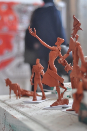 Все кирпично-красные фигурки слеплены из полимерной глины. Саша сказал, что каждый автор сам выбирает подходящий материал для творчества: «Кому-то удобнее высекать из камня, другому лучше моделировать, создавать с нуля».