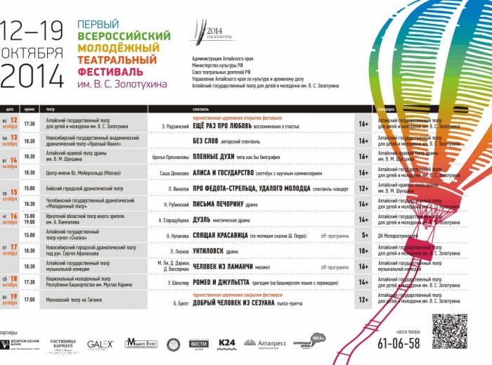 Официальное открытие фестиваля состоится 12 октября на сцене Молодежного театра Алтая. Как сообщила начальник краевого управления по культуре и архивному делу Елена Безрукова, постановки покажут московские Театр на Таганке и Центр имени Всеволода Мейерхольда, новосибирский «Красный факел» и еще более 10 российских театров.