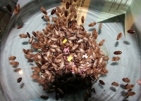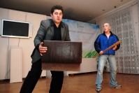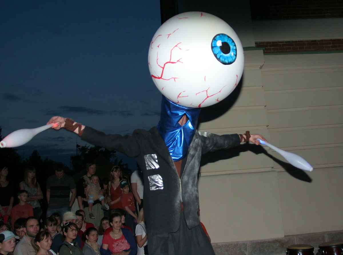 Тем временем, по самому музею прогуливались "живые скульптуры". Сибирская кунсткамера и аттракцион "Преодолей свой страх" словно магнит притягивали любопытную толпу, которая то и дело взвизгивала, поражаясь увиденному. Уголок таксидермиста был представлен такими наглядными материалами, как перчатки для ловли шушпанчиков, подробные инструкции по изготовлению чучел и внутреннее устройство одного из чучел (слабонервным просьба не смотреть). В Музее восковых овощей мадам Куссо можно было увидеть посмертные слепки знаменитых овощей, мумию картофеля умершего от фитофторы или морковь камбаловидную. (Генетическая модификация. Использованы гены крокодила Гены. Есть вредно, но прикольно само по себе.) Чучела же обычных животных вызывали у самых нежных особ женского пола неподдельную жалость и грусть, они выходили из кунсткамеры со словами: "Я не могу смотреть, мне их так жалко". Аттракцион "Преодолей свой страх", представляющий собой аквариум с мраморными тараканами из Южной Америки, собрал вокруг себя не только детей, но и взрослых, которые с неподдельным энтузиазмом отвоевывали у насекомых-людоедов приз – футболку с эмблемой музея.