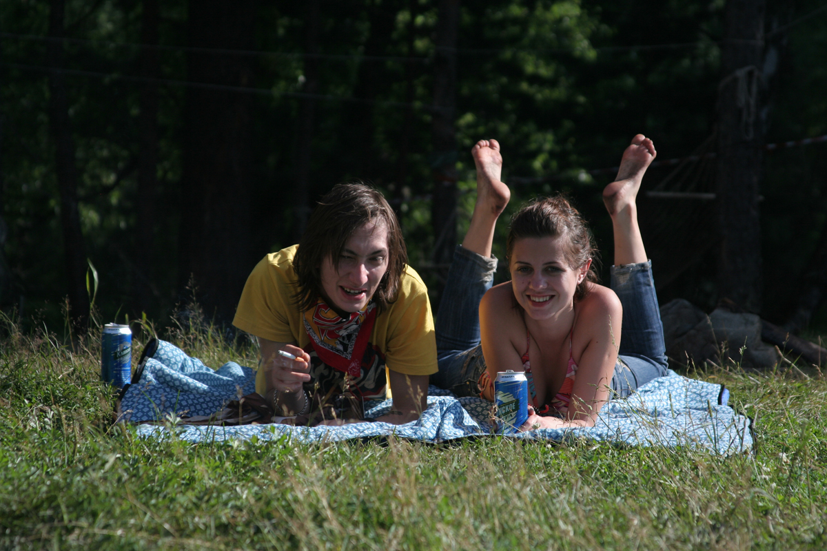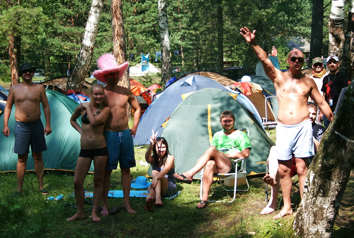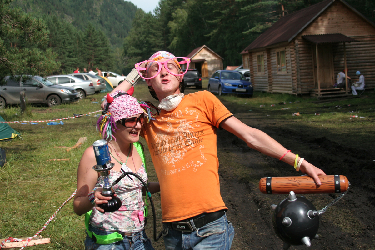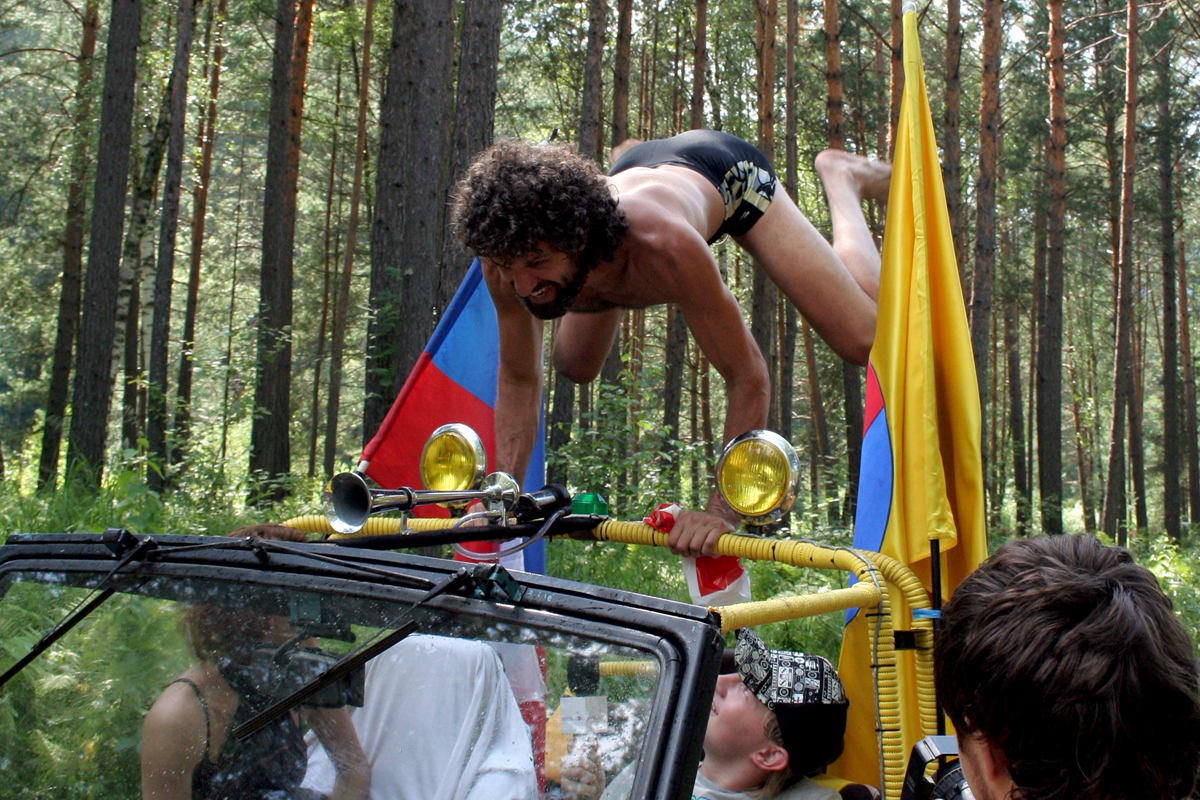 По поляне разъезжают автомобили с торчащими из окон и крыш "зазывалами" (девушками в купальниках и мужчинами в изрядной степени опьянения), которые предлагают всем веселиться и танцевать. Никто не спорит. Среди таких "зазывал" замечен экс-участник "Дома-2" Олег Казанцев, устроивший накануне ночью танцевальное шоу с налетом эротики на сцене. Теперь же в окружении девушек Олег размахивает флагом и выискивает своих земляков-барнаульцев в толпе фестивальщиков, позже на берегу реки он устроит еще одно шоу – чуть менее эротическое, зато более акробатическое.