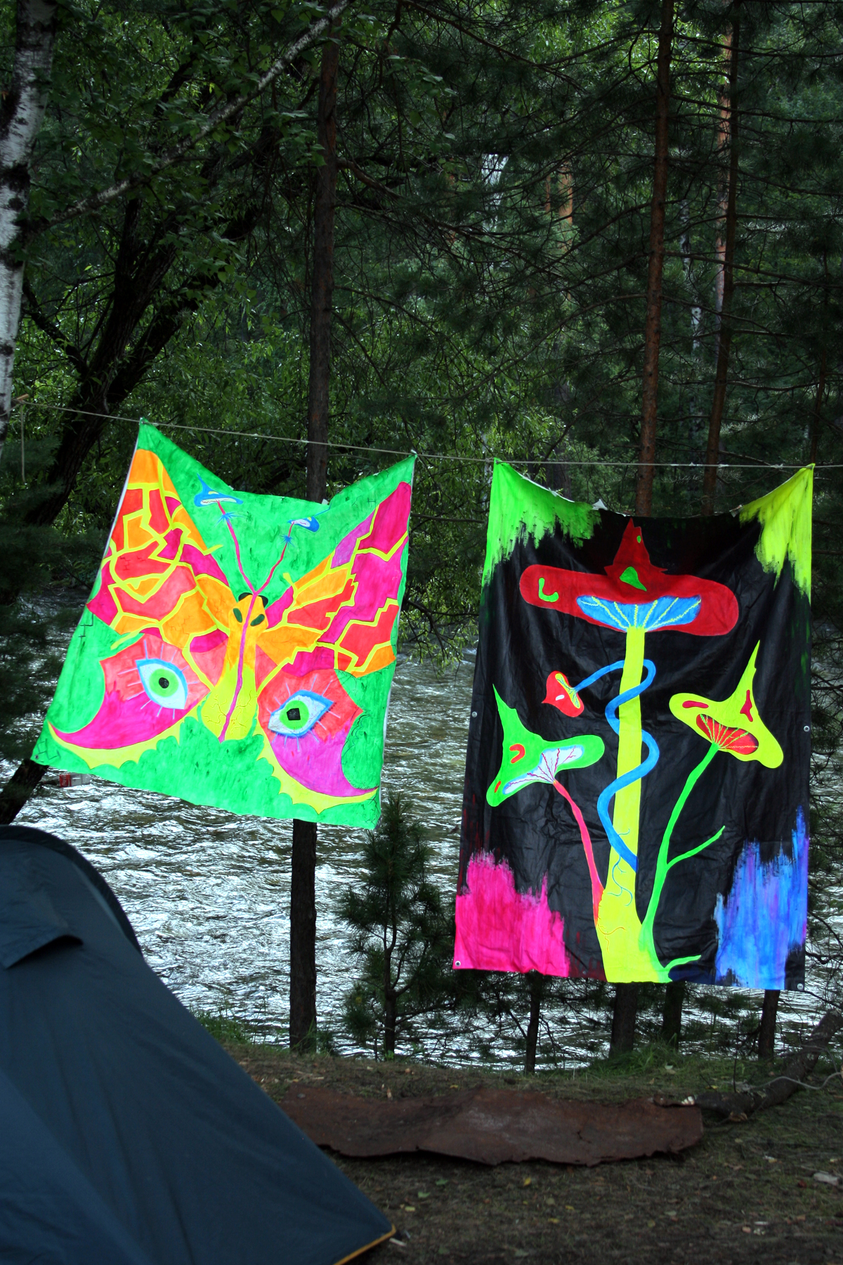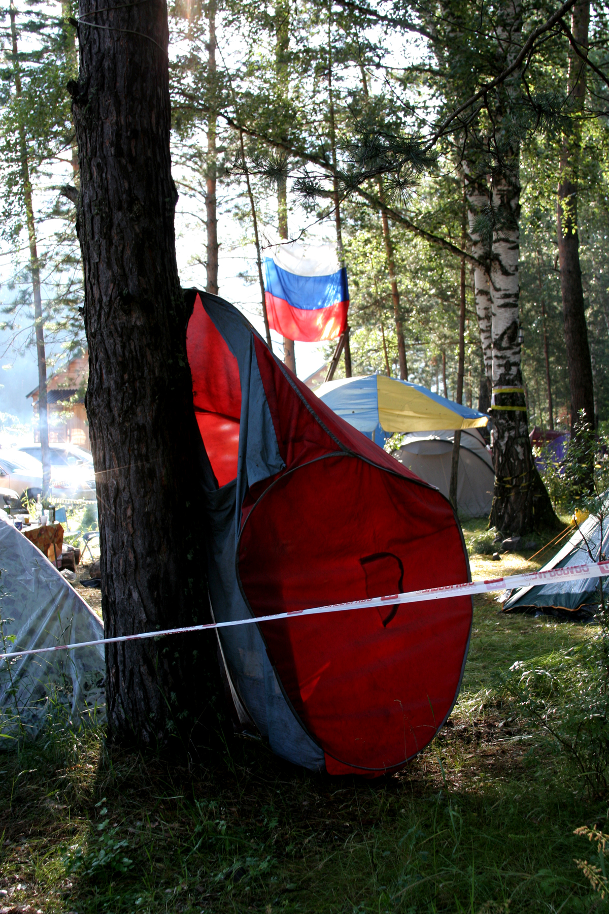 Когда в одном месте собирается много людей, им нужно как-то себя идентифицировать, и если не каждого в отдельности, то хотя бы лагерь. Таблички и флаги всех мастей – от ожидаемых Sunvibes 2009 и триколора до династического флага Романовых и мухоморно-развеселых знамен – повисли на деревьях, заборах и просто в воздухе.