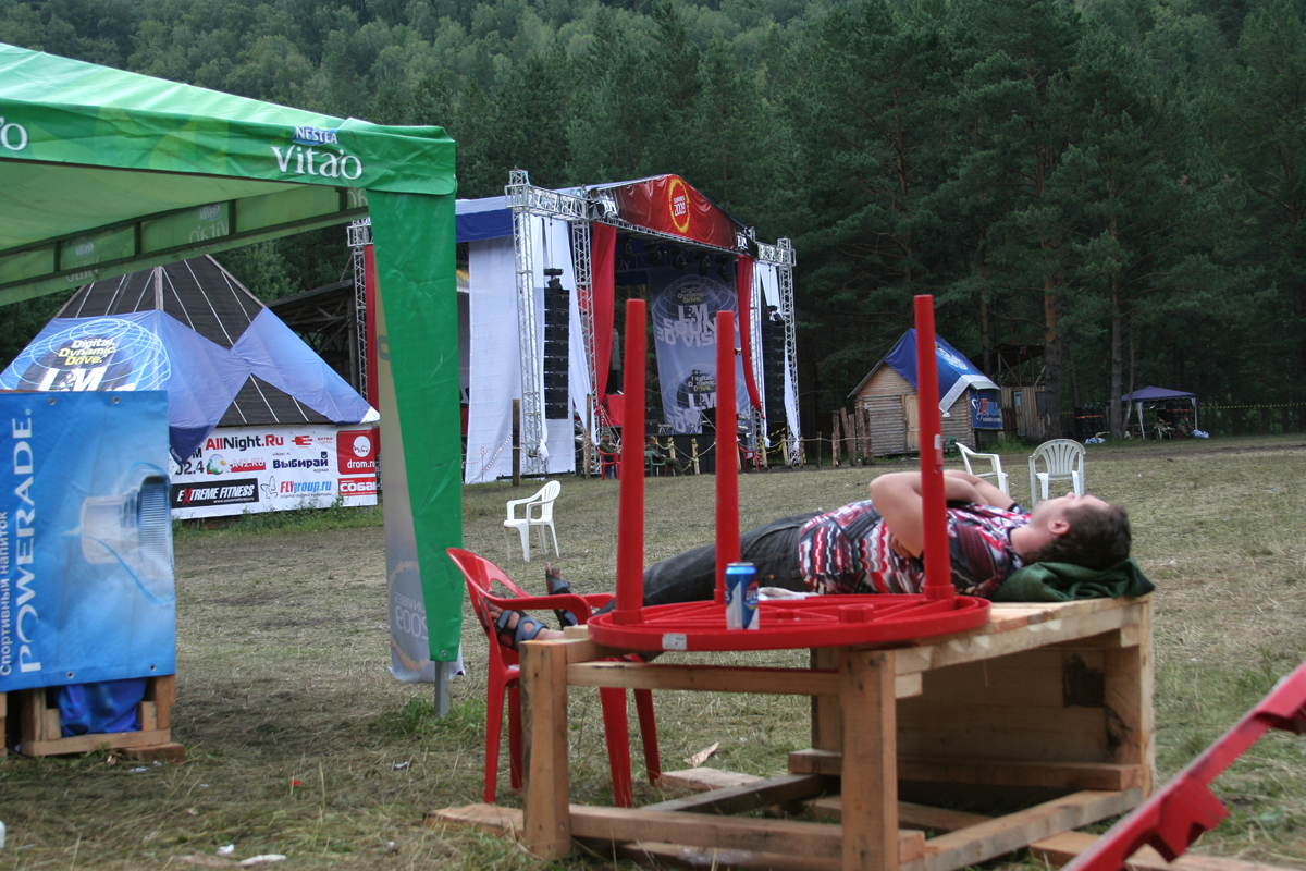 Пока фестивальный народ обживает свои временные жилища, знакомится с соседями и расслабляется, на сцене не до отдыха: здесь настраивают звук и свет, вешают баннеры, примеряются и наводят лоск. Кстати о сцене, местную, видавшую виды, решили не использовать. "Мы полностью монтировали новую сцену…Не стали рисковать, вспоминая о "Спартаке"", – говорит организатор фестиваля Андрей Аникеев.