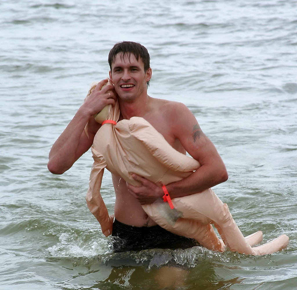 В таком восторге от идеи плыть на резиновой женщине пребывали далеко не все присутствующие дамы. Владимир, победитель первого заплыва, триумфально преодолел дистанцию еще до прихода на пляж своей второй половины: "Я даже не знаю, как она отнесется… Вот сейчас придет и узнаю!"