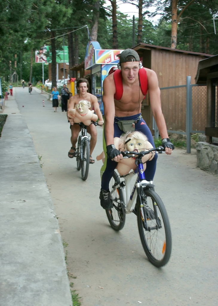 Надо заметить, что в тот день с резиновыми бабами не только плавали: после пары первых заплывов на пляже появились велосипедисты, которые проехали через полгорода с привязанными к велосипедами "женщинами", еще раз наглядно показав, что "резиновая баба – это не роскошь, а средство передвижения". Ну, или дополнение к средству передвижения.