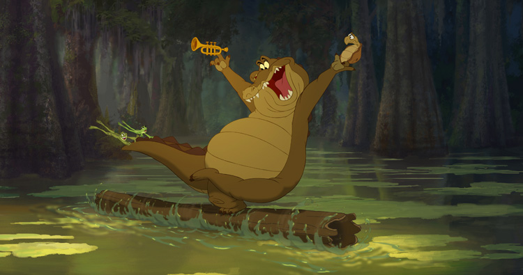 О музыке в "Принцессе и Лягушке" надо говорить отдельно, подробно и, желательно, бесконечно. Начать с того, что место действия – Нью-Орлеан, уже предполагает море джаза. И композитор Рэнди Ньюман дает джаз везде – на улицах, в мечтах, в трамвае, в забегаловке, на болоте, в аду. Есть даже крокодил-трубач с правильным именем Луи и светлячок с не менее правильным именем Рэй и с полчищем музыкальной родни. Правда, ориентированной на кантри.