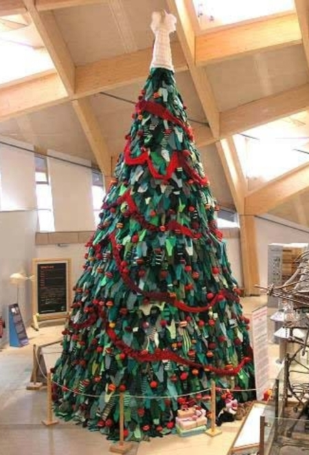 Гигантское новогоднее дерево в десять метров высотой сделали сообща около тысячи мастериц из Великобритании. Верхушка его увенчана вязаным белым ангелом. А сама древо из… рукавов для свитеров. Дамы (в возрасте от 4 до 96 лет) прислали свое вязанье по призыву благотворительной организации The Eden Project. Дерево помогло собрать несколько тысяч долларов.