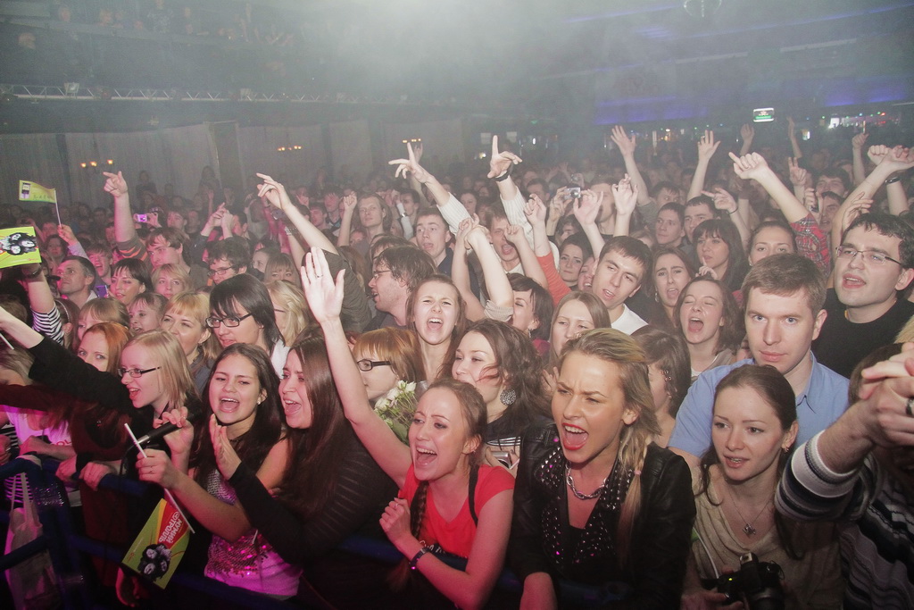 Попавшие наконец в клуб, очень быстро обнаружили, что "vip-столики", расставленные посреди танцпола, никому не нужны. Особенно тем, кто купил билеты, чтобы "потусить с комфортом". Дело в том, что уже за 20 минут до ориентировочного начала концерта все пространство перед сценой было оккупировано плотной толпой поклонников. Причем, настолько плотной, что, заседая за столиками, зритель мог – максимум! – увидеть попы поклонников, а уж никак не самого рокопопсового идола. Положение спасали гигантские экраны, висящие над сценой. Между столиками курсировали девочки, рекламирующие сигареты. Реклама была вполне результативной: к финалу представления в зале было уже практически не продохнуть.